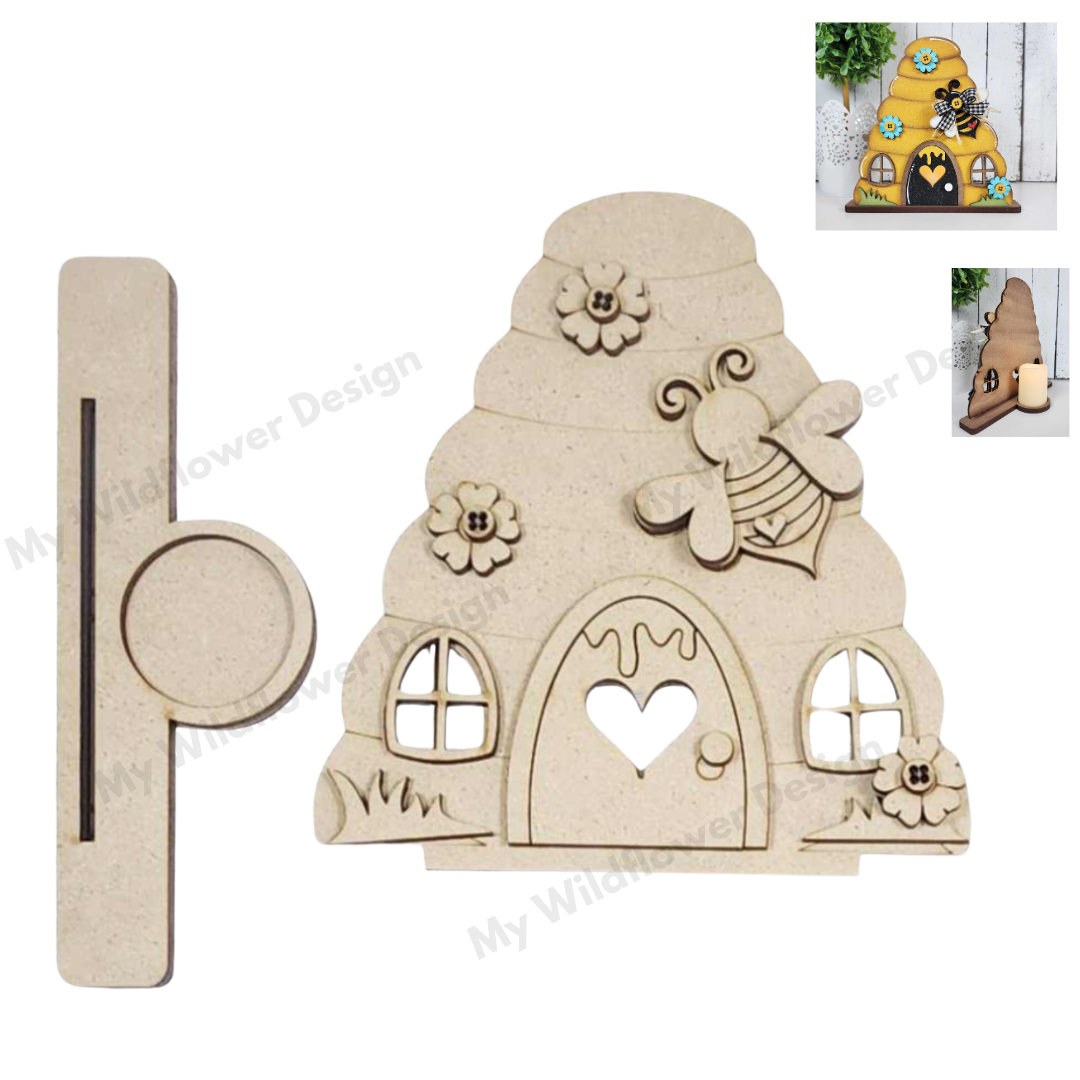 Option 6 -Honey Bee Hive Tealight/Shelf Sitter- Perfect for a splash of whimsy in your home. ** If you add an embellishment kit, Paint, glue, ribbon and raffia will be included. Ribbons may vary. Tea lite not included.