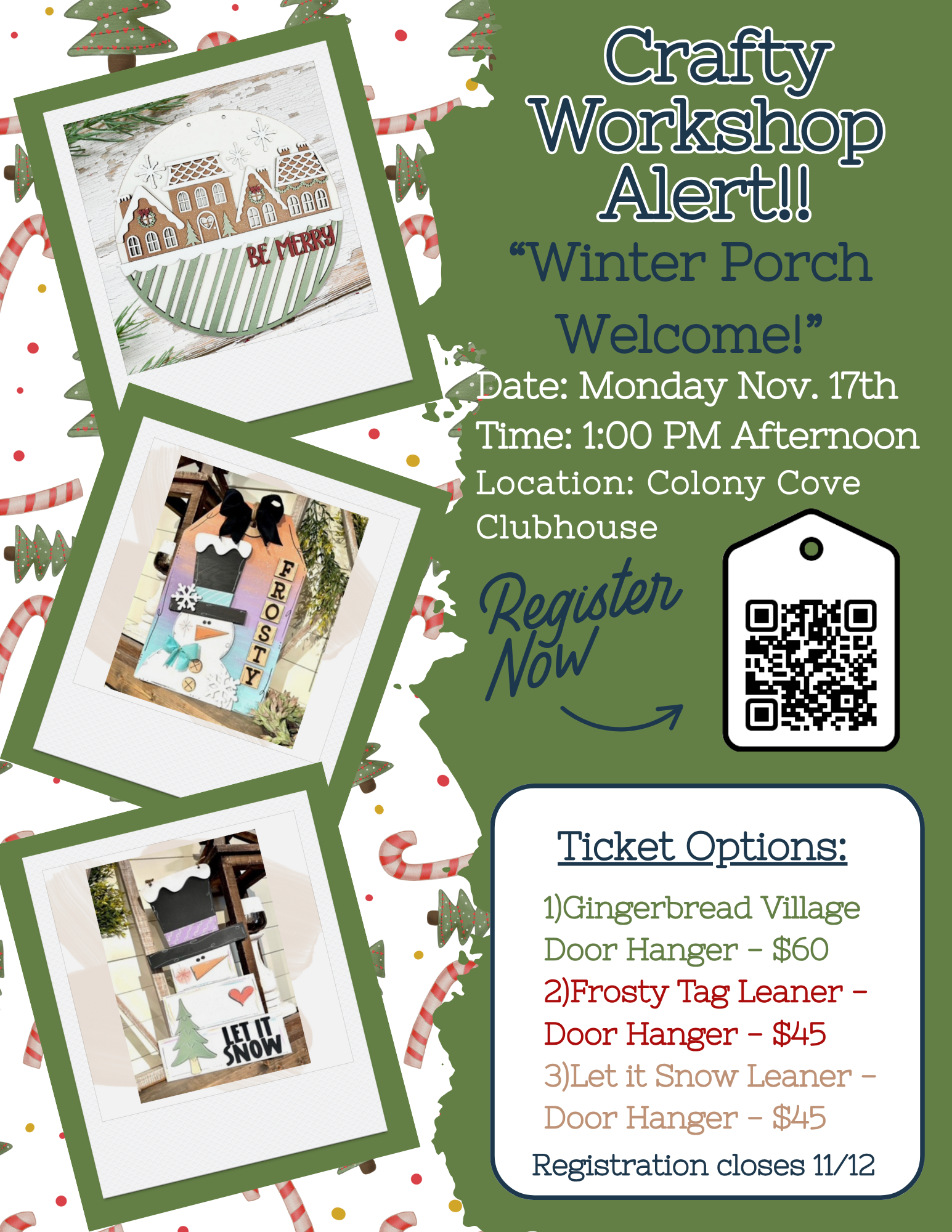 Join us at Colony Cove for a Winter Porch Welcome Workshop on Monday November 17th at 1pm! Let's get ready for the holidays with these beautiful porch signs! No experience necessary!